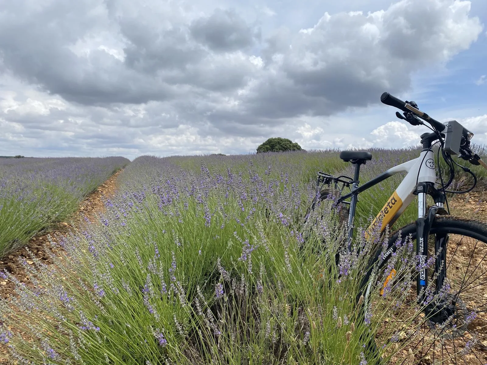 Recuerda que el casco es obligatorio ya que la ruta discurre por algunos tramos de carretera.Es una oportunidad perfecta para disfrutar del vibrante color púrpura de la lavanda, aunque el clima puede ser caluroso en esa época del año, así que hay que equiparse bien y llevar agua. La ruta tiene buenos caminos en general, e incluye un tramo más complicado que implica una subida desde el río, pero con la bici eléctrica es manejable porque si las piernas no pueden, el motor te ayudará. El tramo que discurre por el monte es muy bonito, con monte de quejigos y campos de cultivo. Si tienes suerte, algún corzo puede cruzarse por tu camino, y seguramente algún buitre sobrevolará durante tu excursión. La bajada final es para relajarse, disfrutar e ir parando en los campos de lavanda. Siempre con precaución porque circulamos por la carretera.