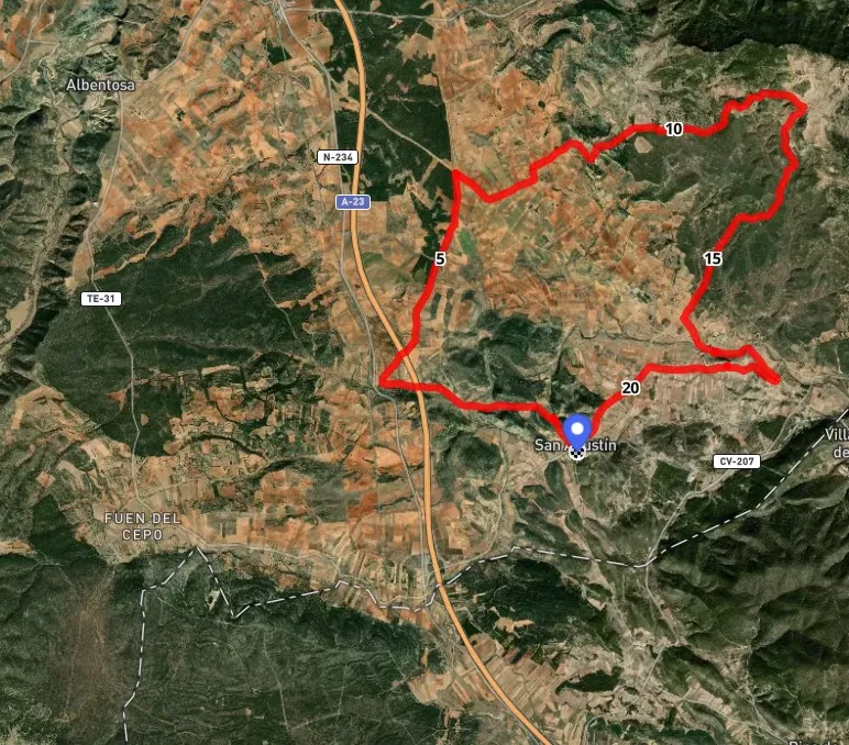 Ruta circular de recorrido mixto, parte asfaltado y parte sin asfaltar. Partiremos desde San Agustín y pasearemos por los caseríos de El Chopo, el Mas Blanco, Los Peiros, Los Baltasares, Los Mases y Tamboril, pasando junto a la fuente de la carrasca para continuar el camino y pasar junto a la Ermita y Castillo de Pradas y finalmente regresar a San Agustín.