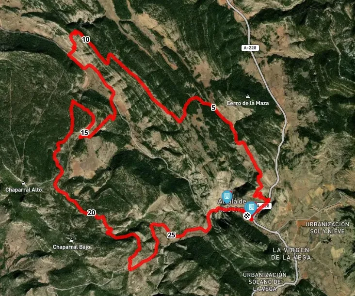 Ruta circular que sale desde Alcalá de la Selva y por la subida del cementerio asciende hasta la Hoya Millán. De allí continúa hasta la Loma del Señor cruzándola para llegar al linde con el término de Cedrillas en la Masada de la Fuendelada de Abajo. Ascenderemos por la carretera hasta la Masada del Altico para de allí subir por la pista a las Lomas Bajas y de allí al Chaparral Alto. Pedalearemos por el Chaparral Alto y si aun tenemos fuerzas podemos desviarnos para subir al Portillo Ramiro. Volveremos a la Ruta para continuar hasta la carretera de Cabra de Mora por la que volveremos de nuevo al Pueblo.