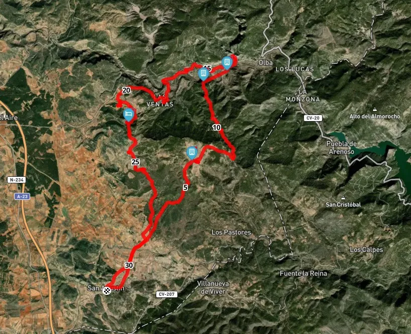 Ruta circular de recorrido mixto, parte asfaltado y parte sin asfaltar. Partiremos desde San Agustín en dirección a los Mases y pasearemos por Los Peiros, de ahí bajaremos hasta Los Ramones. Una vez salimos a la carretera TE-2001, empieza un ascenso de 6 km, pasando por Los Pertegaces y los Villanueva hasta tomar una pista a la derecha que nos lleva de regreso a San Agustín.